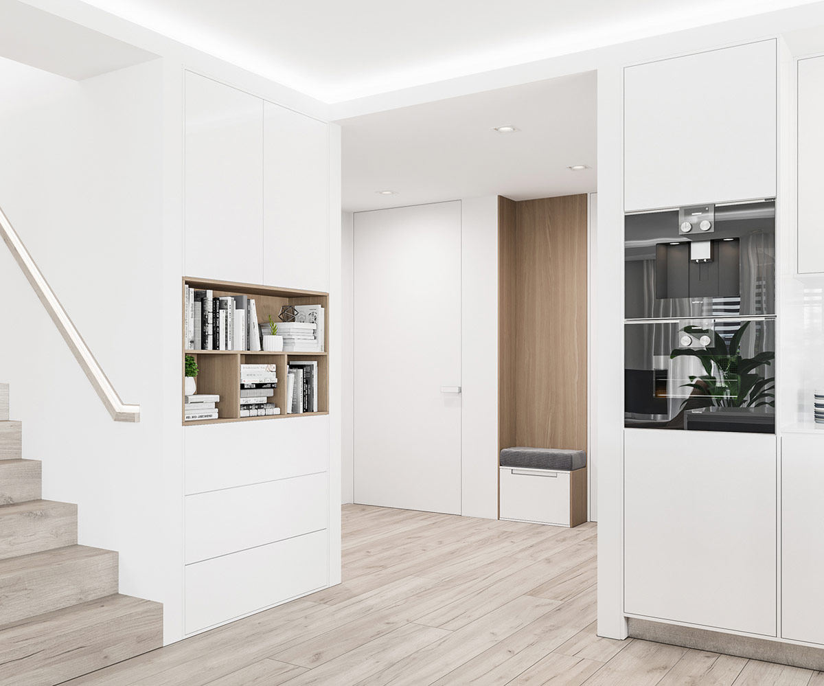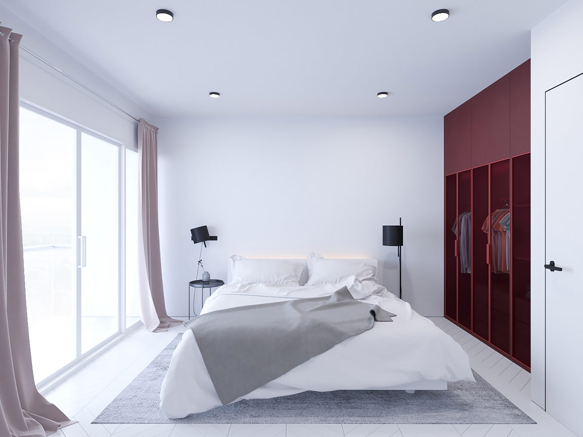 灰白条纹的地毯是整个空间素净的白和低调的灰的过渡